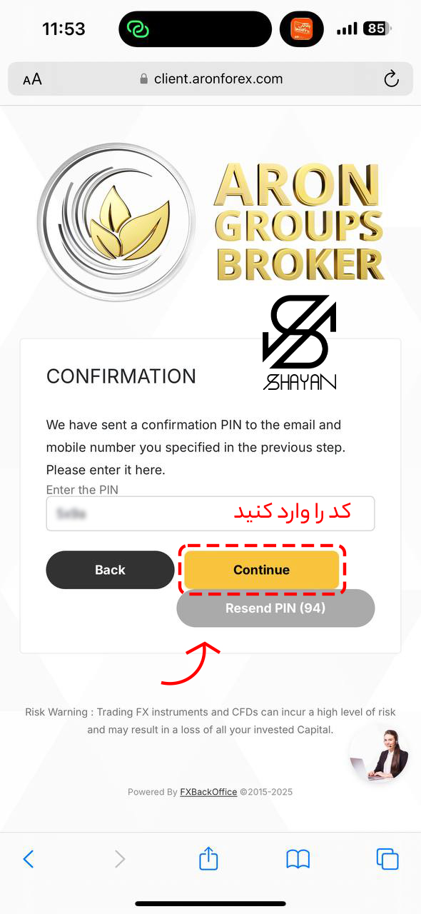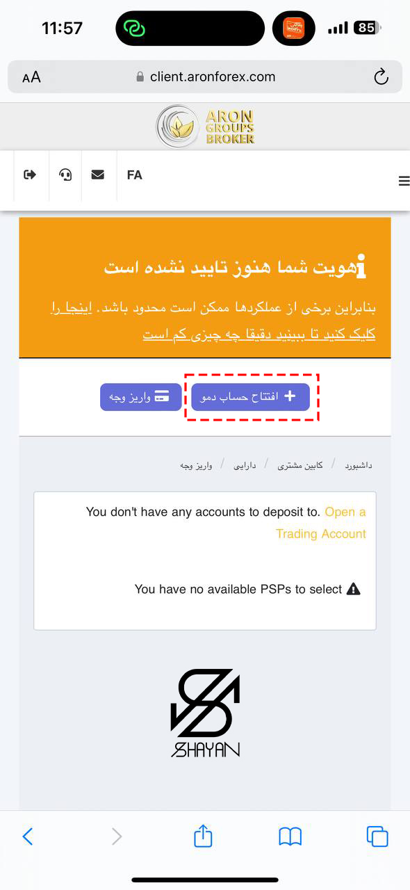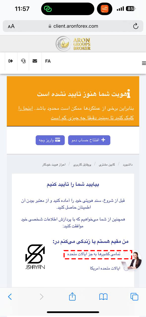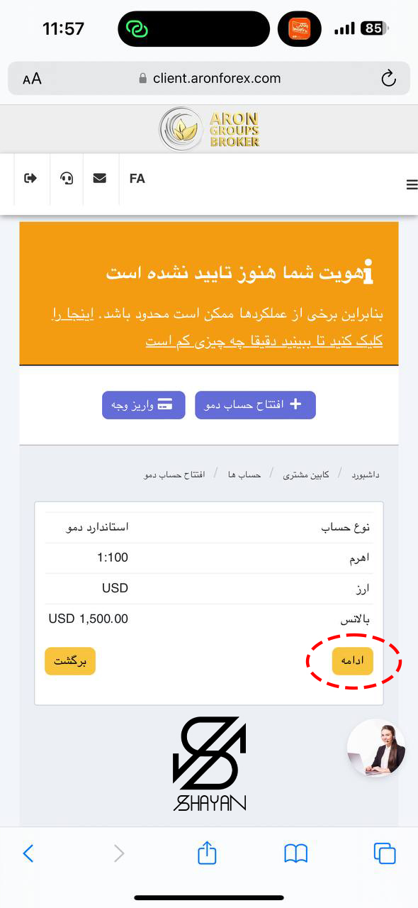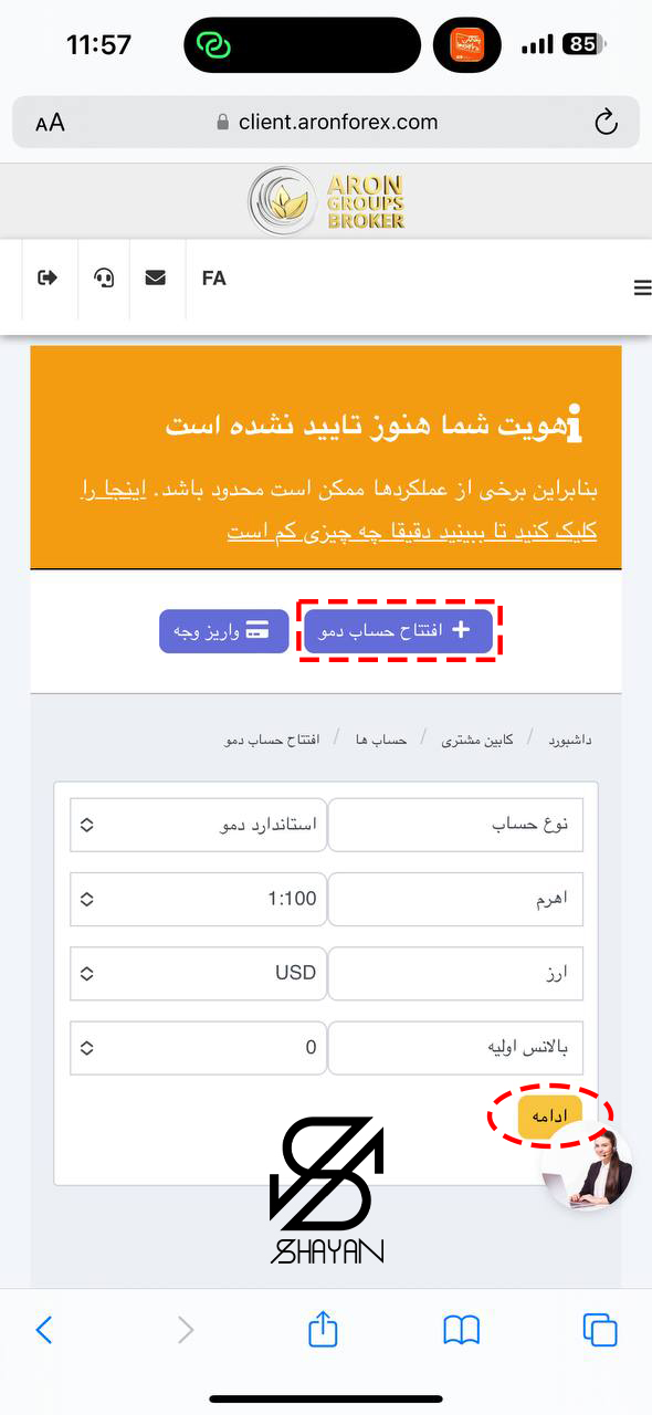 تایید هویت: ابتدا باید در سایت بروکر آرون گروپس ثبت نام کنید و مراحل تایید هویت خود را کامل کنید.