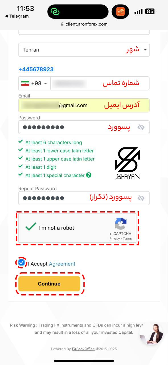 پس از وارد کردن تمامی اطلاعات، تیک مربوط به تایید توافقنامه را بزنید تا موافقت خود را با شرایط و قوانین بروکر اعلام کنید، سپس فرم را ارسال کنید.
