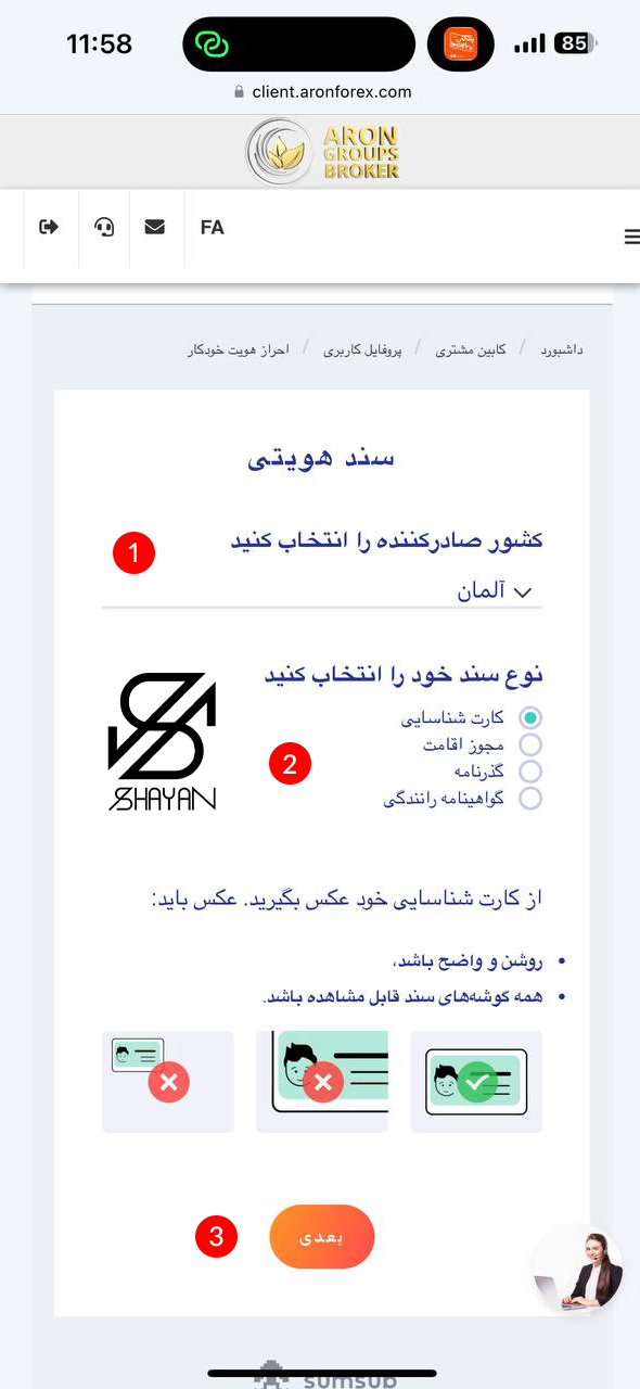 ۳. نوع سند هویتی خود را انتخاب کنید.
