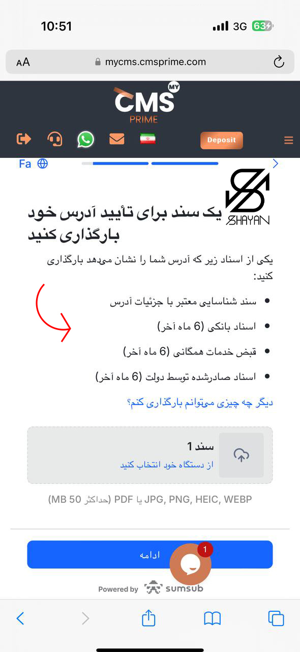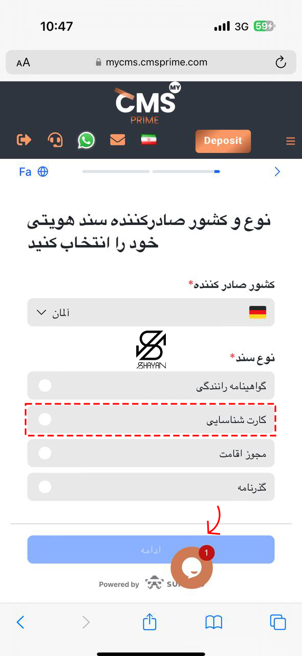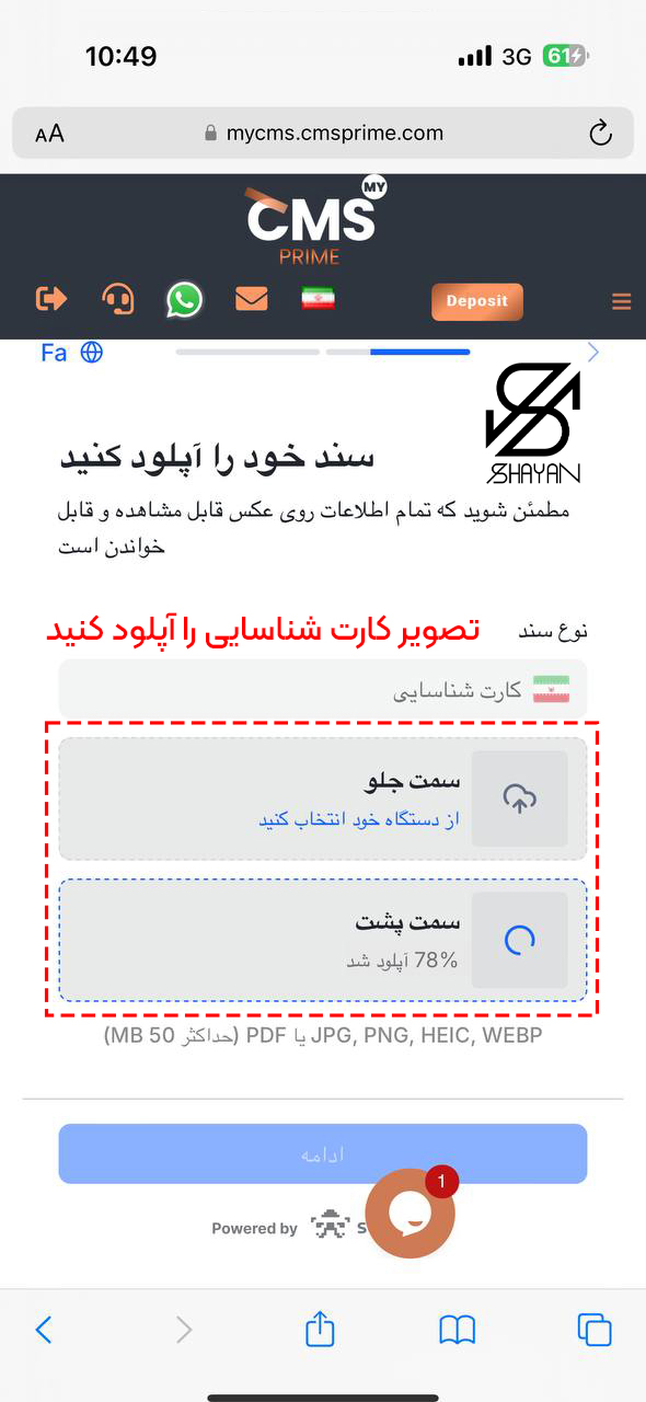 • آپلود مدارک شناسایی: مدارکی مانند کارت ملی یا پاسپورت را اسکن کرده و بارگذاری کنید.