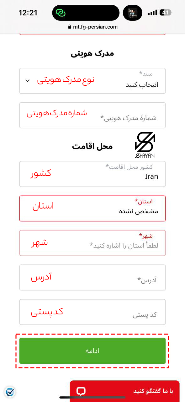 - بارگذاری مدارک شناسایی: اسکن پاسپورت یا کارت شناسایی معتبر را به همراه قبض آب و برق برای تأیید محل سکونت بارگذاری کنید.
