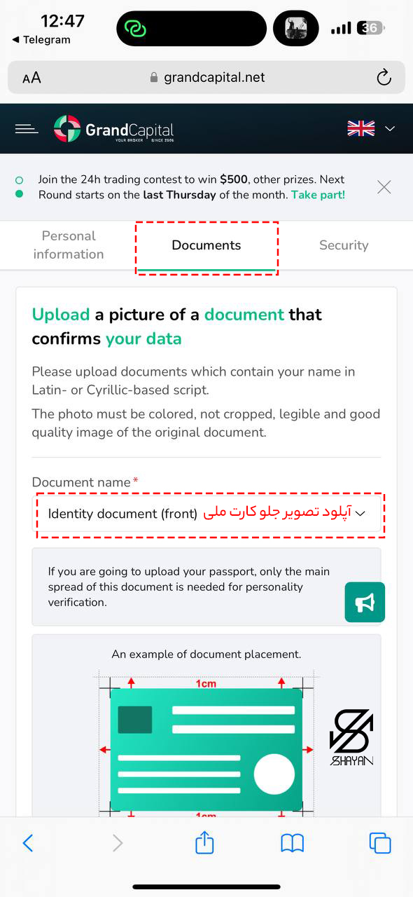 آپلود عکس مدرک شناسایی: برای تایید هویت خود، باید عکسی از یک مدرک شناسایی معتبر آپلود کنید. دقت کنید که عکس باید رنگی، بدون برش، خوانا و با کیفیت بالا باشد.