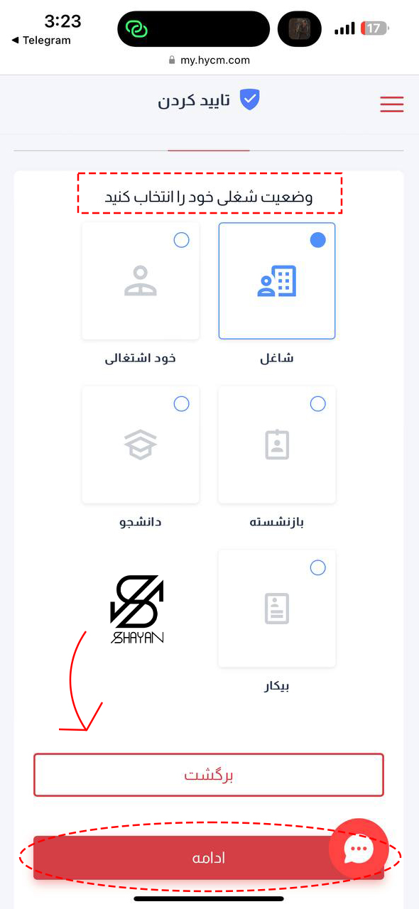 ۳. وضعیت شغلی خود را انتخاب کنید.