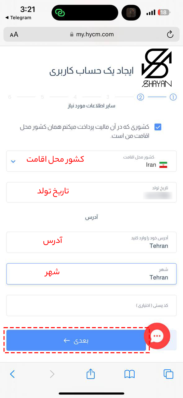 ۴. کشور محل اقامت و آدرس خود را وارد کنید.
