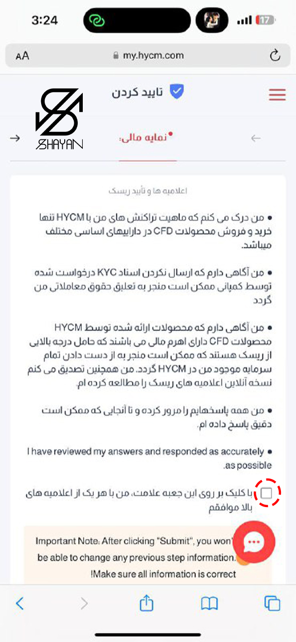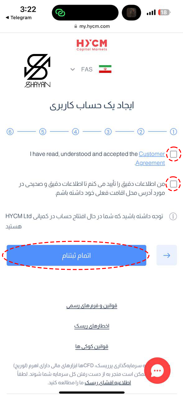 پس از تکمیل تمامی اطلاعات، اظهارنامهای که نشان میدهد شما در حال افتتاح حساب در HYCM Limited هستید را تایید کنید و روی دکمه نهاییسازی ثبت نام کلیک کنید.