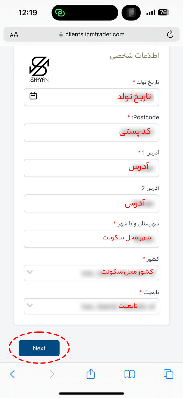 • Postcode / Zip code (کد پستی): کد پستی محل سکونت را وارد کنید.