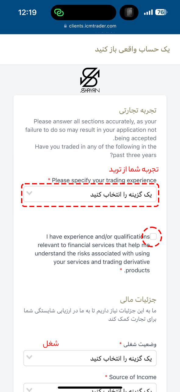• Forex and CFD experience (تجربه معاملاتی در فارکس و CFD): تجربه خود را انتخاب کنید.