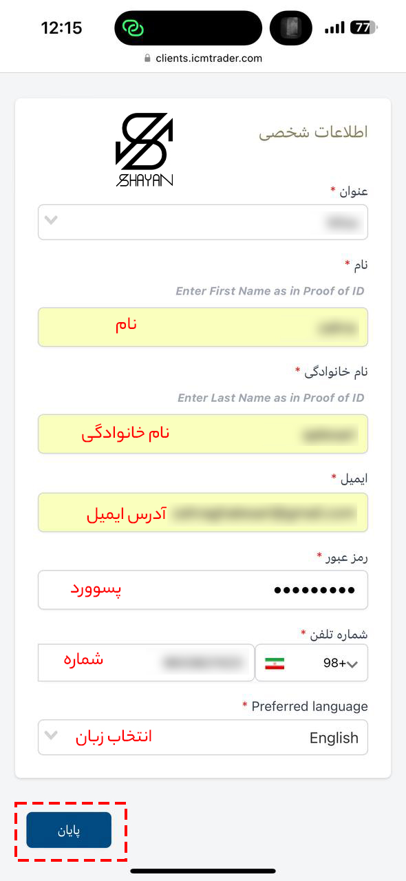 • Phone number (شماره تلفن): شماره تلفن خود را وارد کنید (پیش‌فرض به کد ایران +98 تنظیم شده است).