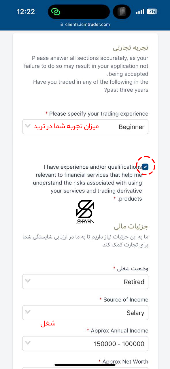 سوالات مربوط به تجربه معاملاتی خود را با دقت پاسخ دهید، زیرا این اطلاعات بر تایید حساب شما تاثیر می‌گذارد.