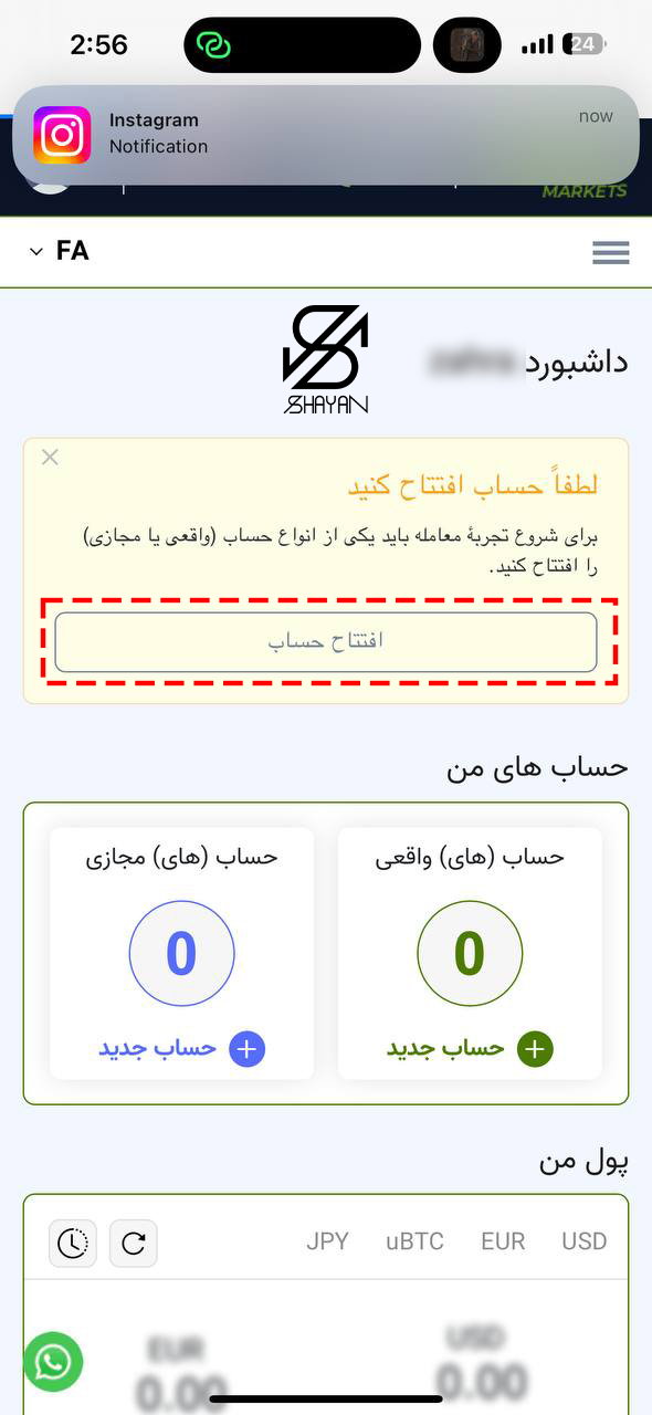 وارد قسمت داشبورد شوید و گزینه افتتاح حساب را انتخاب کنید.