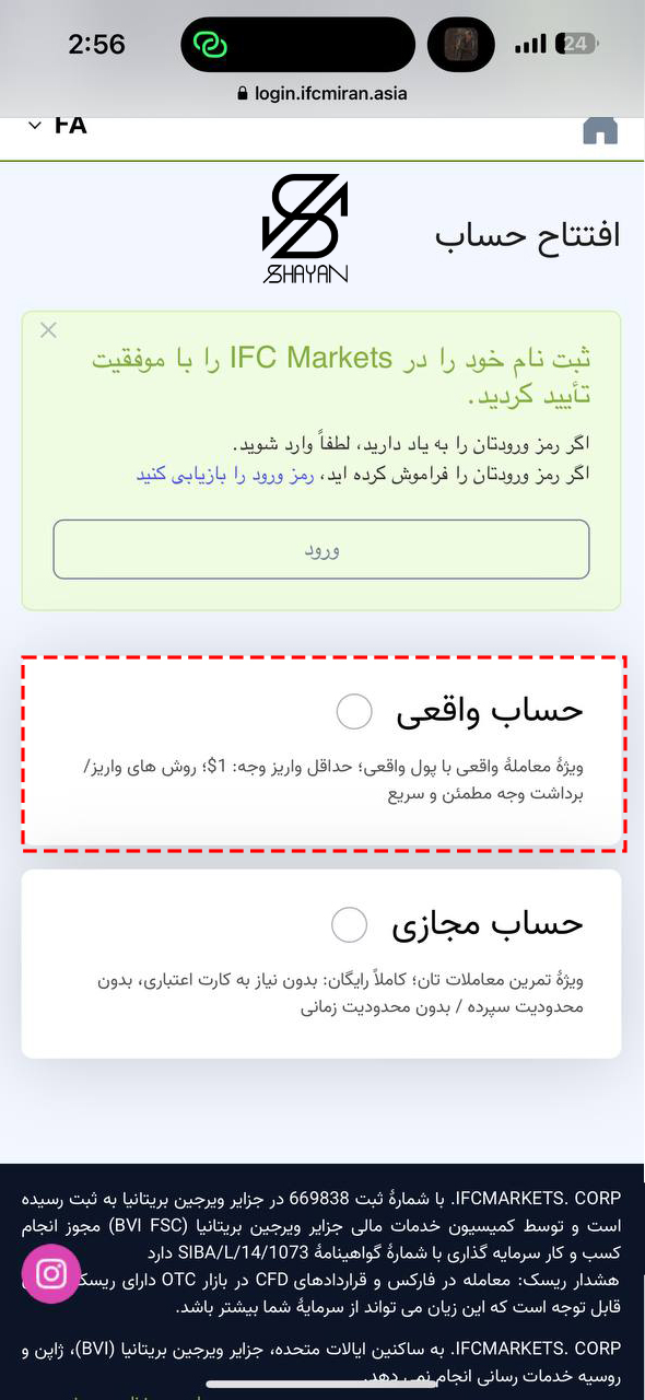 حساب واقعی را انتخاب کنید تا ثبت نام انجام شود.