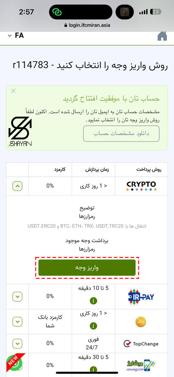 ۲. انجام واریز وجه