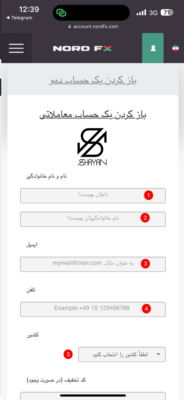 وارد کردن اطلاعات شخصی: نام و نام خانوادگی، ایمیل، شماره تلفن، و کشور محل سکونت را وارد کنید.