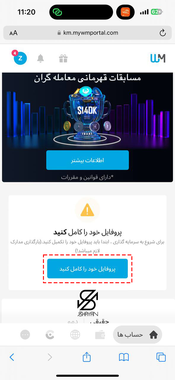 ابتدا وارد حساب کاربری خود شوید و به داشبورد بروکر دسترسی پیدا کنید. سپس روی گزینه تکمیل پروفایل کلیک کنید.