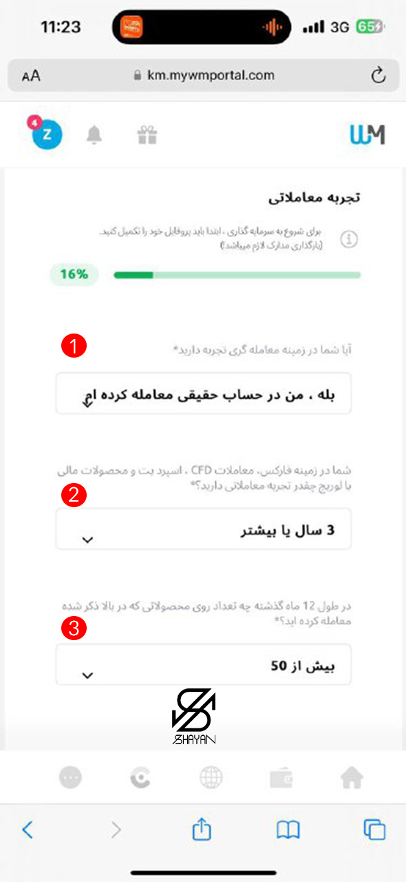 مشخص کنید که آیا تجربه معاملاتی دارید یا خیر. همچنین مدت زمان و تعداد معاملاتی که در 12 ماه گذشته انجام دادهاید را وارد کنید.