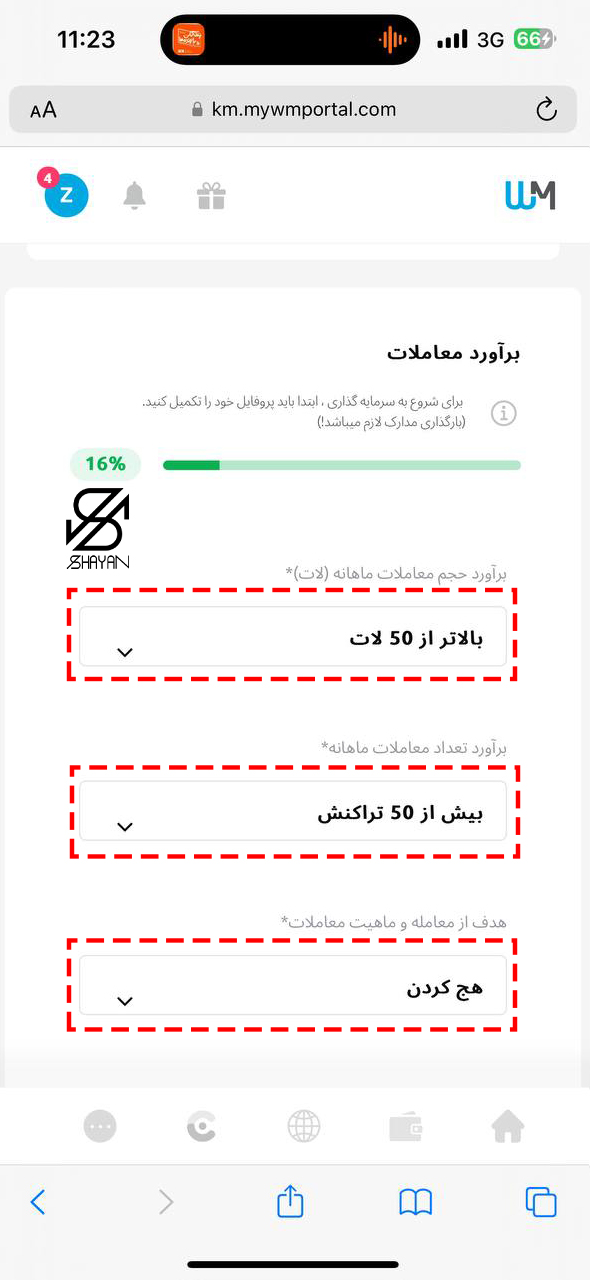 اطلاعات مربوط به موقعیت شغلی، منبع درآمد و ارزش خالص داراییها را تکمیل کنید. این اطلاعات برای ارزیابی سطح تجربه و منابع مالی شما جهت معاملات استفاده میشود.
