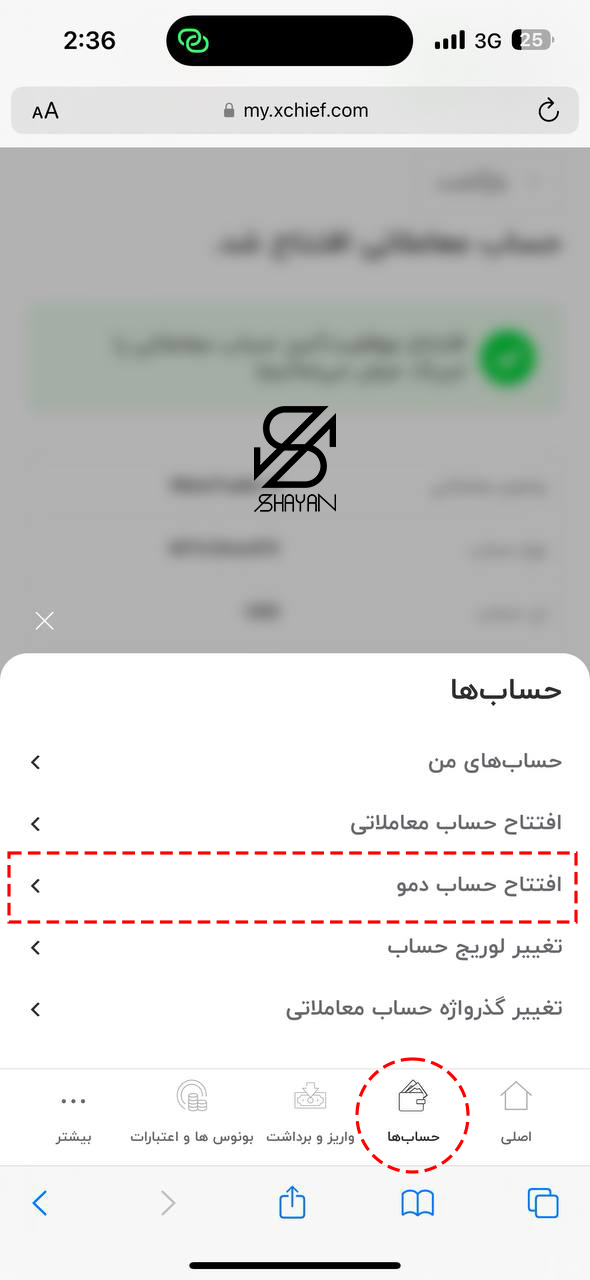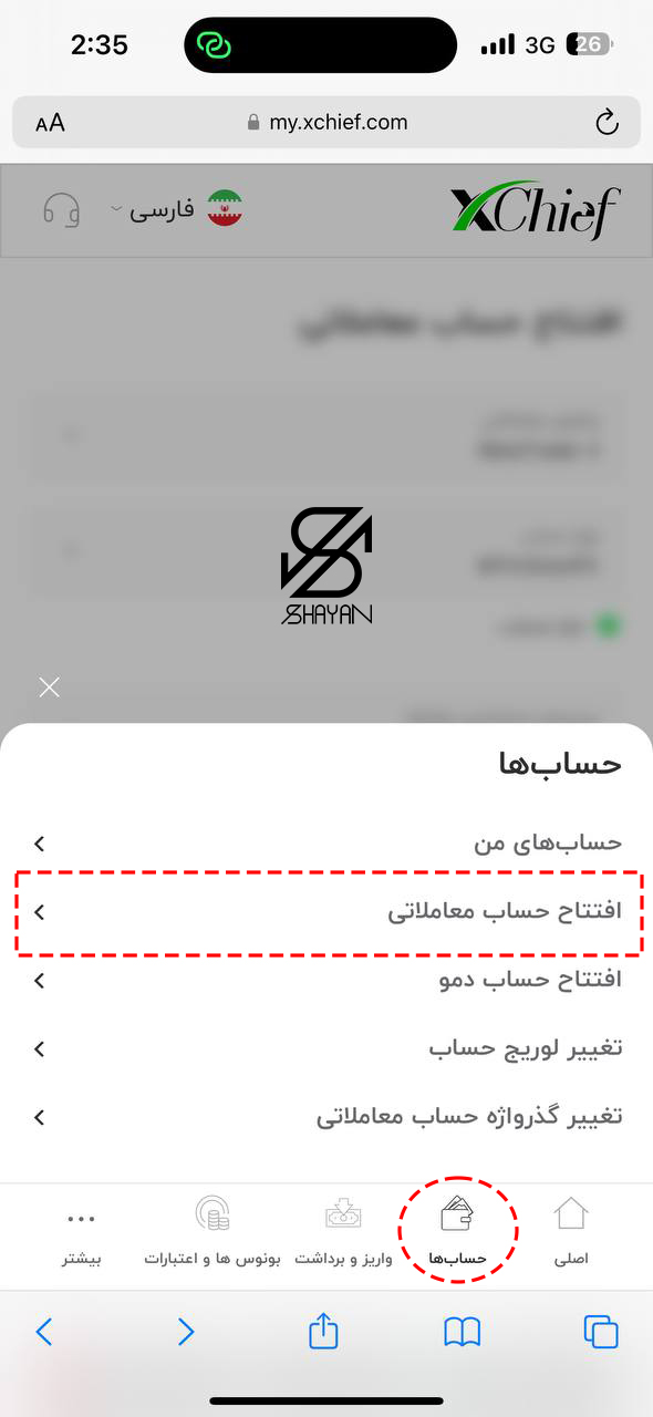 1. ابتدا وارد حساب کاربری خود در سایت ایکس چیف شوید و به بخش مدیریت حساب‌ها بروید.