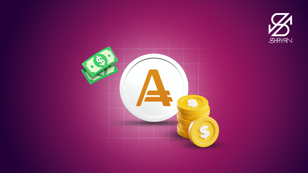 تصویر طراحی شده لوگوی بروکر ارانته به همراه نمودارهای رو به رشد تریدینگ و سکه‌های ارز دیجیتال در اطراف آن