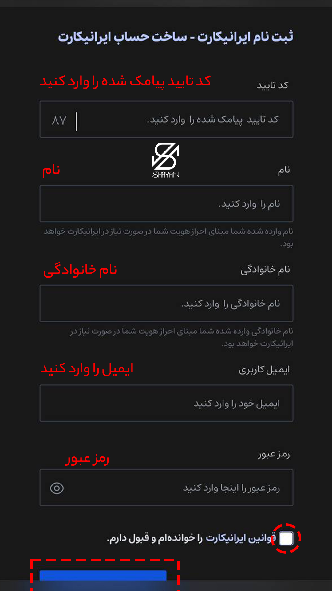 - گام دوم ثبتنام اولیه: در صفحه اصلی اپلیکیشن، گزینه «ثبتنام» را پیدا کنید. بعد شماره موبایل معتبر خود را وارد نموده و کد تأیید ارسال شده را دریافت و وارد کنید. در ادامه سیستم از شما میخواهد یک ایمیل فعال و در دسترس را ثبت نمایید؛