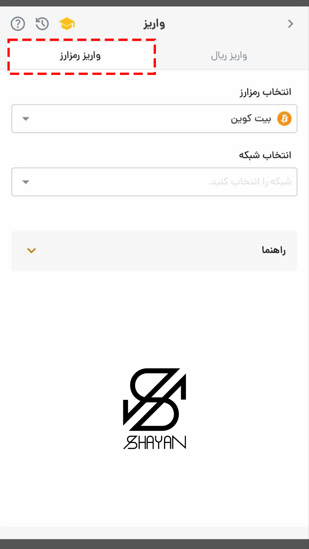 ۲. همچنبن می‌توانید برای واریز گزینه واریز رمز ارز را نیز انتخاب کنید.