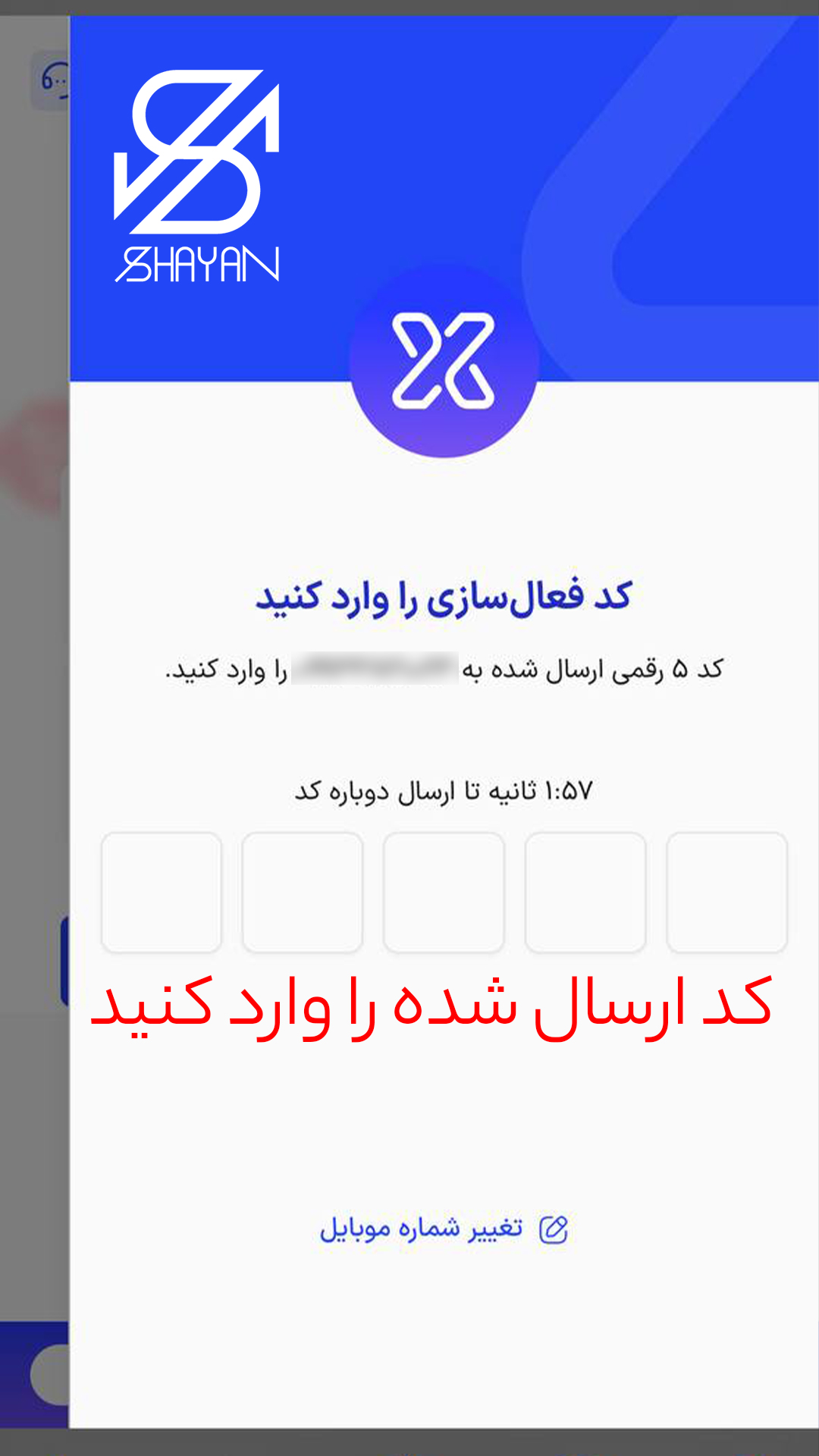 پس از وارد کردن اطلاعات یک کد تأیید 5 رقمی به موبایل یا ایمیل شما ارسال خواهد شد. این کد را در کادر مربوطه وارد نمایید.