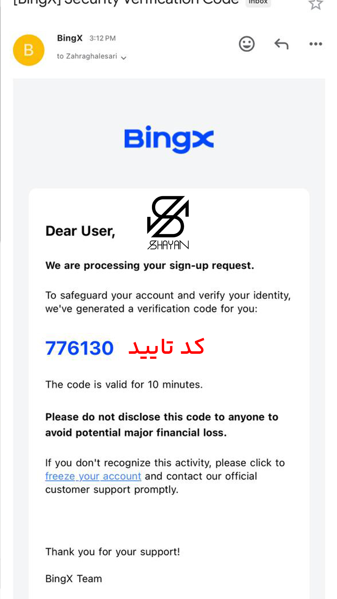 پس از ثبت اطلاعات بینگایکس کد تأییدی به ایمیل شما ارسال میکند. این کد معمولاً ۶ رقمی بوده و برای احراز هویت ضروری است. باید آن را در کادر مربوطه در صفحه ثبت نام وارد نمایید. این مرحله امنیتی جهت جلوگیری از ایجاد حسابهای غیرمجاز طراحی شده است. دقت کنید کد را دقیقاً همانطور که دریافت کردهاید وارد نمایید.